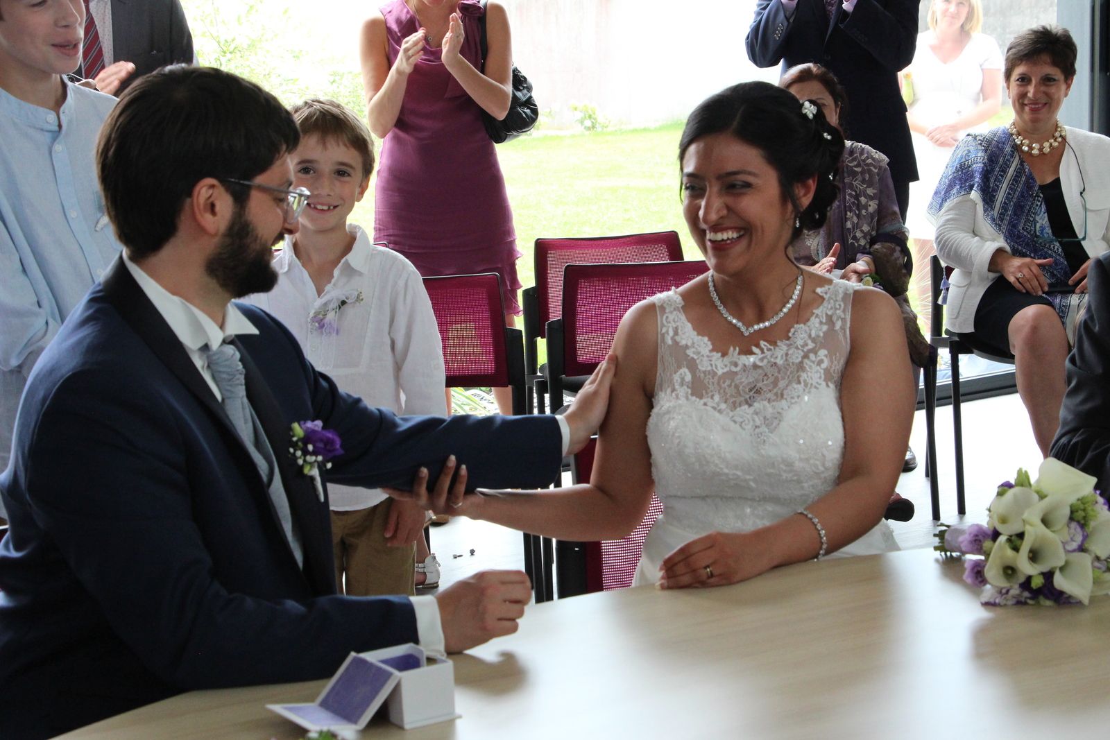 eMmA explique aux deux petits neveux chargés d'apporter la boîte contenant les alliances le contenu de la petite boîte à trésors. Puis, les mariés duement bagués !